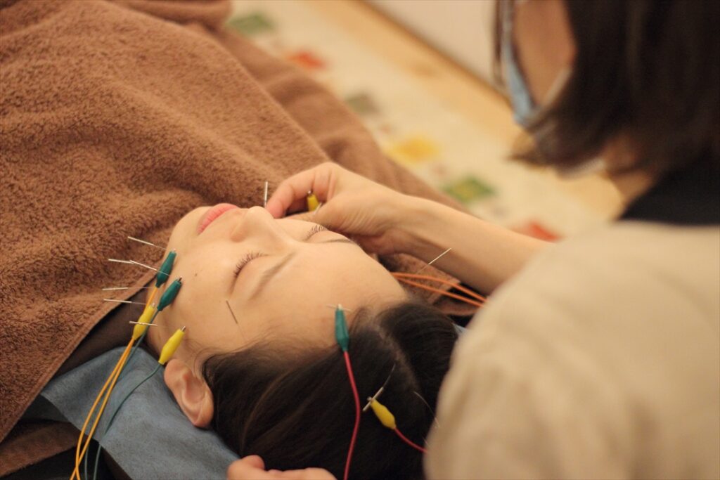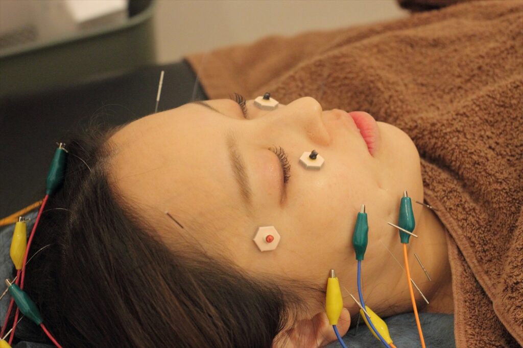 最後にお顔の筋肉に電気を流したあとに、抜鍼していきます。施術直後から顔全体のスッキリ感・目の開きやすさを実感いただけます。
